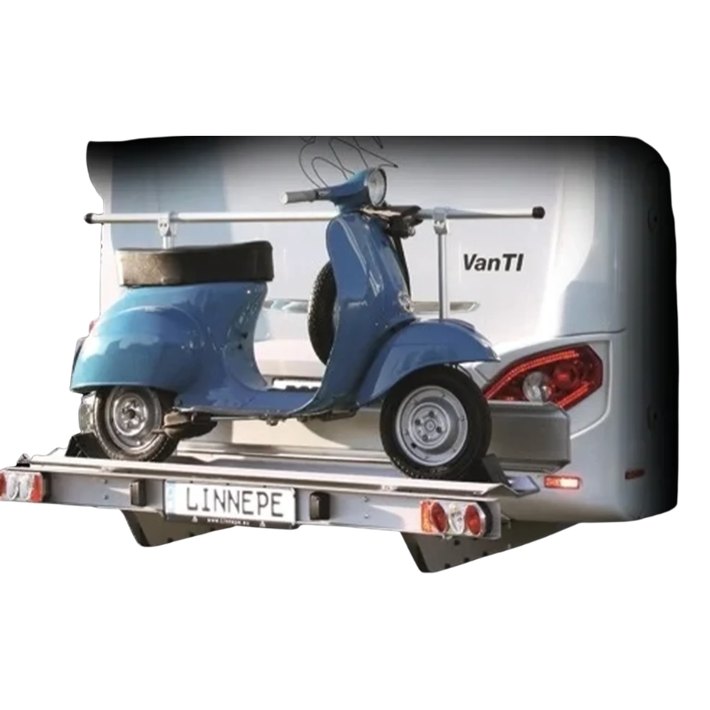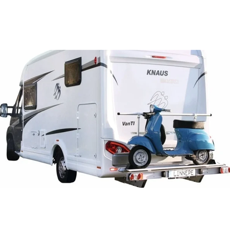 Suport pentru motocicleta sau scuter Findus, sarcina max 150 kg.  Acest model este din aluminiu, are o greutate de numai 28 kg si adauga la lungimea autovehicolului doar 49 cm. Este versatil, putand adauga pe langa sina de motocicleta inca 2 sine pentru biciclete (care trebuie achizitionate separat). Este compatibil cu toate autorulotele cu sasiu extins sau sasiu ALKO. Suportul este omologat CEsi include rampa pentru incarcarea / descarcarea motocicletei.  Dupa instalarea initiala la un service, acesta se poate monta  sai demonta usor. Pachetul nu include conexiunea electrica la autovehicol..